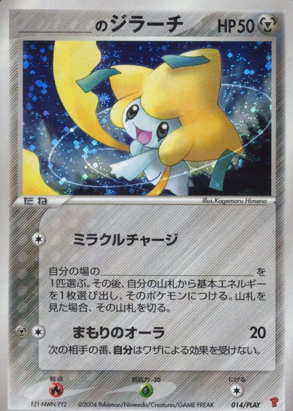 ____'s Jirachi's Pokemon cards are available in at least 1 sets. ____'s Jirachi's biggest 7-day price movers are 2004 Japanese PLAY Promo #014/PLAY 2nd Season Subscription.
