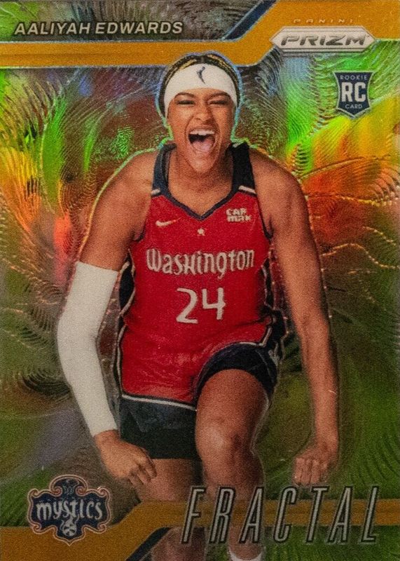 Aaliyah Edwards' Basketball cards are available in at least 13 sets. Aaliyah Edwards' biggest 7-day price movers are 2024 Prizm WNBA #70 Silver, 2024 Prizm WNBA #70 WNBA Logo, and 2024 Prizm WNBA #3 Fractal - Gold /10.