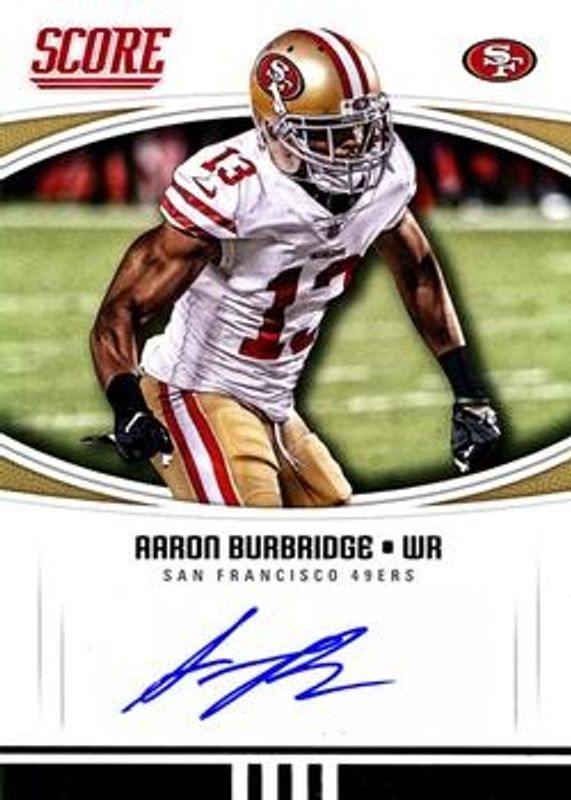 Aaron Burbridge's Football cards are available in at least 25 sets. Aaron Burbridge's biggest 7-day price movers are 2018 Score #40 Signatures, 2016 Black Gold Collegiate #1 Autographs - Jersey Prime /25, and 2016 Black Gold Collegiate #1 Autographs Jersey - Super Prime /1.