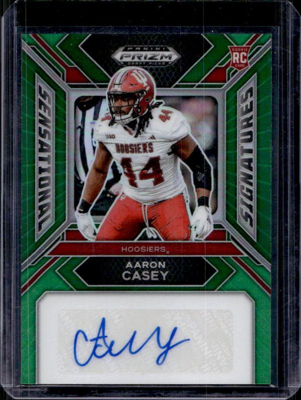 The biggest 30-day change Aaron Casey cards are 2024 Prizm Draft Picks #SS-ACY Sensational Signatures - Green, 2024 Prizm Draft Picks #SS-ACY Sensational Signatures, and 2024 Prizm Draft Picks #SS-ACY Sensational Signatures - Orange Wave.