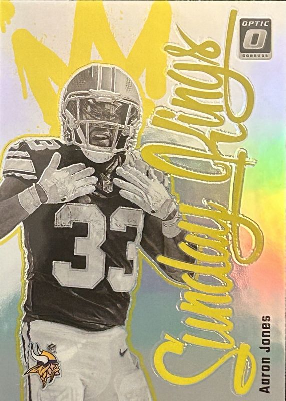 Aaron Jones Sr.'s Football cards are available in at least 88 sets. Aaron Jones Sr.'s biggest 7-day price movers are 2024 Optic #26 Sunday Kings /(SSP), 2023 Mosaic #MM-20 Micro Mosaic /(SSP), and 2025 Prizm #8 All Purpose - Gold /10.