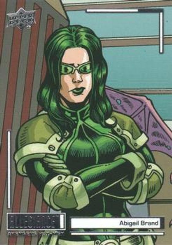 Abigail Brand's Marvel cards are available in at least 1 sets. Abigail Brand's biggest 7-day price movers are 2023 Upper Deck Allegiance Avengers vs X-Men #C56 Base, 2023 Upper Deck Allegiance Avengers vs X-Men #C56 Red Rainbow, and 2023 Upper Deck Allegiance Avengers vs X-Men #C56 Avengers Red & Blue /12.