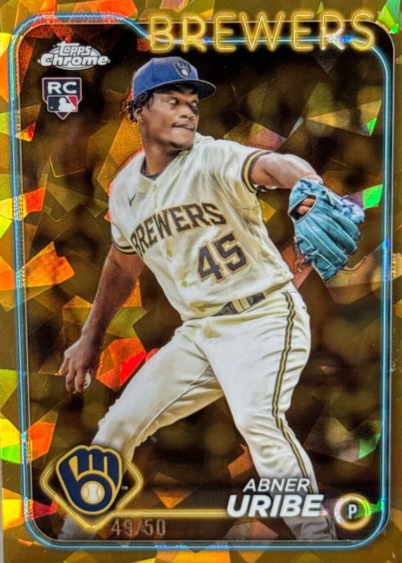 Abner Uribe's Baseball cards are available in at least 9 sets. Abner Uribe's biggest 7-day price movers are 2023 Bowman Chrome #CPA-AU Prospect Auto (1st), 2024 Topps Chrome Sapphire Edition #310 Gold /50, and 2025 Crusade #30 Majestic Marks - Platinum /1.