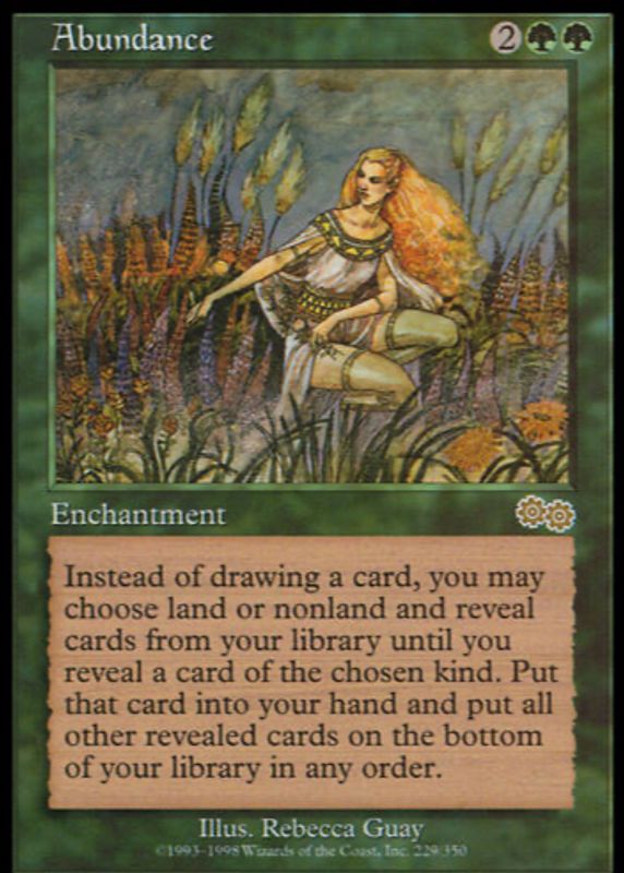 Abundance's Magic: The Gathering cards are available in at least 1 sets. Abundance's biggest 7-day price movers are 1998 Urza's Saga #229 Base.