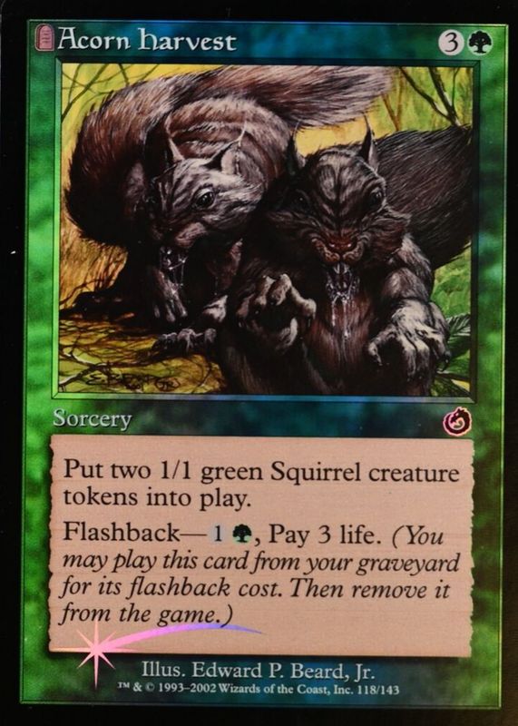 Acorn Harvest's Magic: The Gathering cards are available in at least 1 sets. Acorn Harvest's biggest 7-day price movers are 2002 Torment #118 Foil, and 2002 Torment #118 Base.