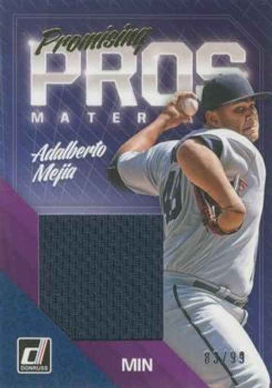 The biggest 30-day change Adalberto Mejia cards are 2018 Donruss #PPM-AM Promising Pros Materials - Gold /99, 2018 Donruss #PPM-AM Promising Pros Materials - Black /25, and 2018 Donruss #PPM-AM Promising Pros Materials.