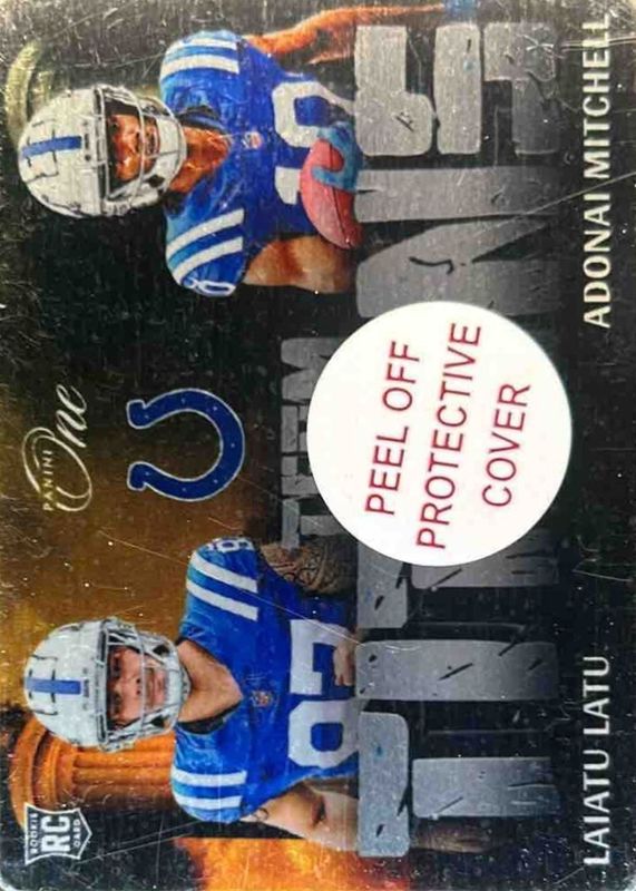 Adonai Mitchell / Laiatu Latu's Football cards are available in at least 3 sets. Adonai Mitchell / Laiatu Latu's biggest 7-day price movers are 2024 One #TT-IND Team Titans /(SSP), 2024 Totally Certified #9 Rookie Dual Swatches - Mirror Platinum Gold /10, and 2024 Totally Certified #9 Rookie Dual Swatches - Mirror Platinum Nebula /1.