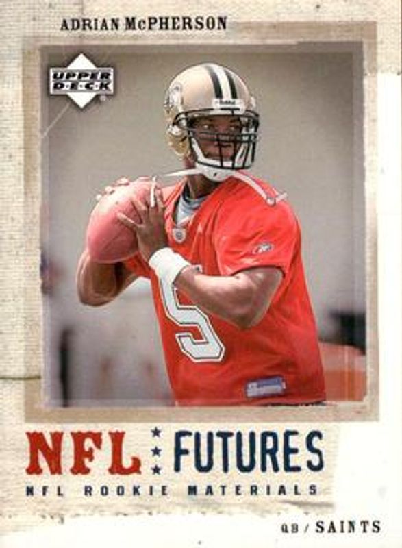Adrian McPherson's Football cards are available in at least 3 sets. Adrian McPherson's biggest 7-day price movers are 2005 Upper Deck Rookie Materials #97 Base, 2005 Topps Heritage #239 Base, and 2005 eTopps #89 Base /1200.