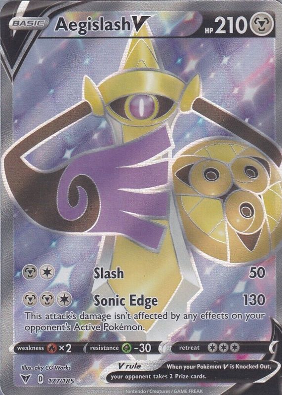 Aegislash V's Pokemon cards are available in at least 2 sets. Aegislash V's biggest 7-day price movers are 2020 Sword & Shield: Vivid Voltage #177/185 Holo (Full Art), 2020 Sword & Shield: Vivid Voltage #126/185 Holo, and 2020 Japanese Sword & Shield: Amazing Volt Tackle #108/100 Super Rare.