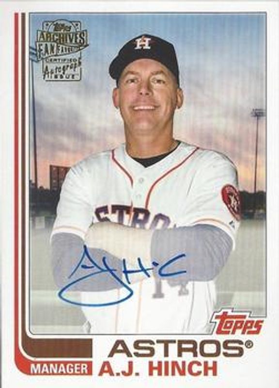 AJ Hinch's Baseball cards are available in at least 12 sets. AJ Hinch's biggest 7-day price movers are 2018 Topps Archives #FFA-AH Fan Favorites Autographs, 2018 Topps Archives #FFA-AH Fan Favorites Autographs - Purple /150, and 2018 Topps Archives #FFA-AH Fan Favorites Autographs - Blue /25.