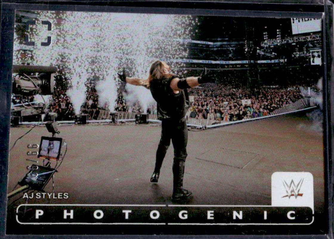 AJ Styles' Wrestling cards are available in at least 25 sets. AJ Styles' biggest 7-day price movers are 2024 Photogenic WWE #53 Silver /99, 2024 Photogenic WWE #53 Swirl FOTL /6, and 2024 Photogenic WWE #53 Maze /25.