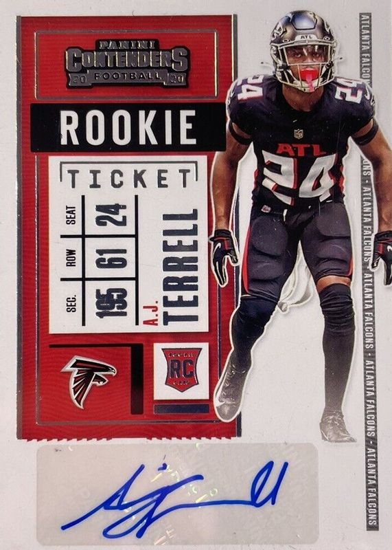 AJ Terrell's Football cards are available in at least 3 sets. AJ Terrell's biggest 7-day price movers are 2020 Contenders #290 Rookie Ticket Auto, 2020 Contenders #290 Rookie Ticket Auto - Playoff Ticket /99, and 2020 Contenders #290 Rookie Ticket Auto - Wild Card /(SSP).
