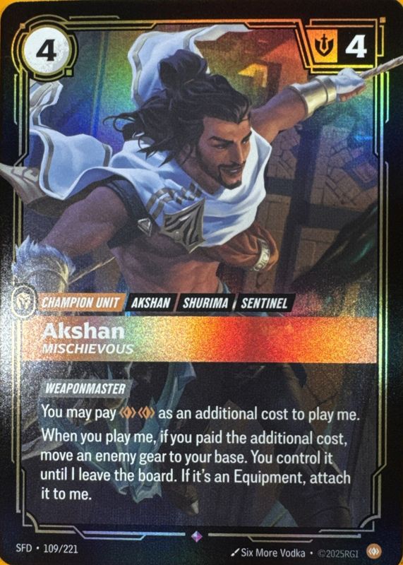 Akshan - Mischievous' Riftbound cards are available in at least 1 sets. Akshan - Mischievous' biggest 7-day price movers are 2026 Spiritforged #109/221 Foil.