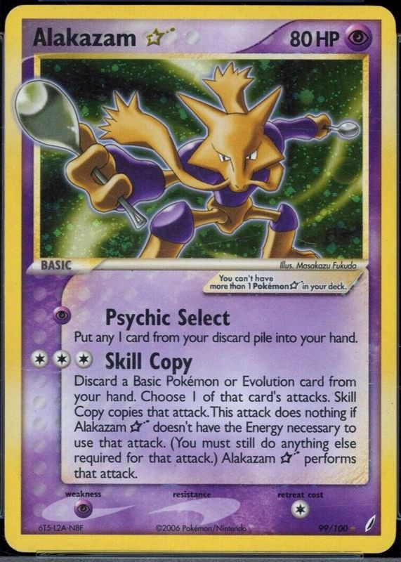 Alakazam Star's Pokemon cards are available in at least 2 sets. Alakazam Star's biggest 7-day price movers are 2006 Japanese EX: Miracle Crystal #033/075 1st Edition Holo, 2006 Japanese EX: Miracle Crystal #033/075 Unlimited Holo, and 2006 EX: Crystal Guardians #99/100 Holo.