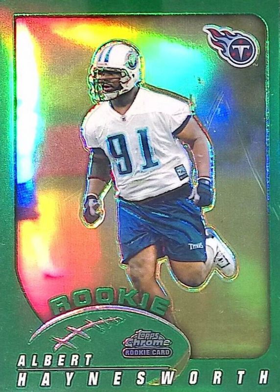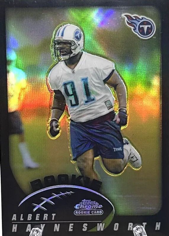 Albert Haynesworth's Football cards are available in at least 6 sets. Albert Haynesworth's biggest 7-day price movers are 2002 Topps Chrome #186 Base, 2002 Topps Chrome #186 Black Refractor (Rookie) /100, and 2002 Topps Finest #94 Base.