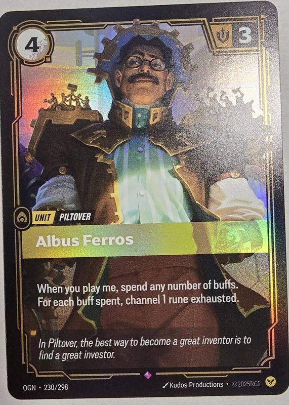 Albus Ferros' Riftbound cards are available in at least 1 sets. Albus Ferros' biggest 7-day price movers are 2025 Origins #230/298 Foil.