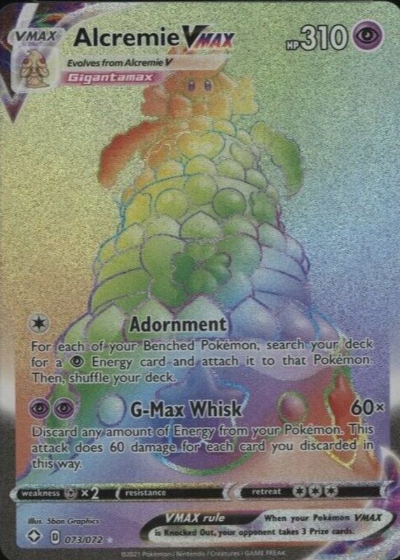 Alcremie VMAX's Pokemon cards are available in at least 3 sets. Alcremie VMAX's biggest 7-day price movers are 2020 Champion's Path #23/73 Holo, 2021 Sword & Shield: Shining Fates #073/072 Holo (Secret), and 2020 Japanese Sword & Shield: Legendary Heartbeat #086/076 Hyper Rare.