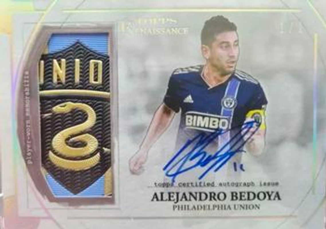 Alejandro Bedoya's Soccer cards are available in at least 16 sets. Alejandro Bedoya's biggest 7-day price movers are 2022 Topps Renaissance MLS Major League Soccer #AR-AB1 Autographed Relics - Platinum /1, 2022 Topps Renaissance MLS Major League Soccer #AR-AB9 Autographed Relics - Ruby /5, and 2022 Topps Renaissance MLS Major League Soccer #EA-AB1 Renaissance Engravement Autographs - Platinum /1.