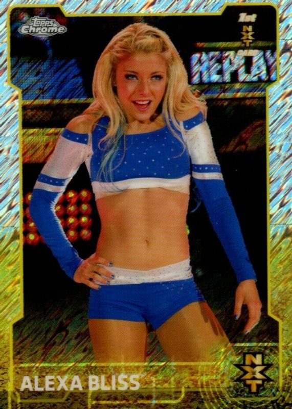Alexa Bliss' Wrestling cards are available in at least 69 sets. Alexa Bliss' biggest 7-day price movers are 2015 Topps Chrome WWE #92 Base, 2015 Topps Chrome WWE #92 Shimmer Refractor /10, and 2024 Prizm WWE #138 Orange /99.