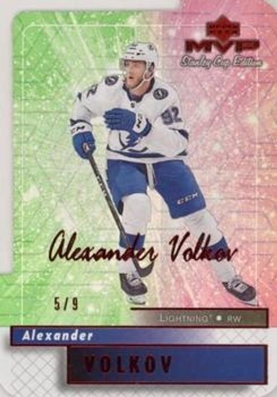 The biggest 30-day change Alexander Volkov cards are 2019 Upper Deck #106 MVP Stanley Cup Edition Colors & Contours Purple Update /9, 2019 Upper Deck #106 MVP Stanley Cup Edition Colors & Contours Update /99, and 2019 Upper Deck #P-77 UD Portraits - Gold /25.