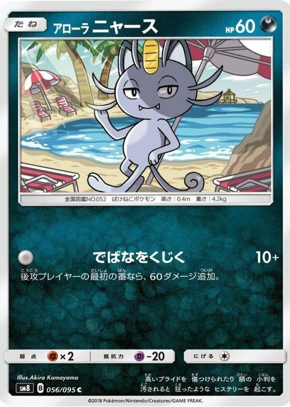 Alolan Meowth's Pokemon cards are available in at least 1 sets. Alolan Meowth's biggest 7-day price movers are 2018 Japanese Sun & Moon: Super-Burst Impact #056/095 Base.