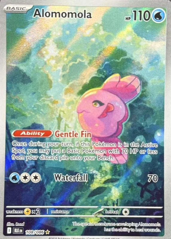 Alomomola's Pokemon cards are available in at least 10 sets. Alomomola's biggest 7-day price movers are 2025 Scarlet & Violet: Black Bolt #108/086 Illustration Rare, 2012 Japanese Black & White: Dragon Blast #018/050 1st Edition, and 2017 Japanese Sun & Moon: Alolan Moonlight #012/050 Base.