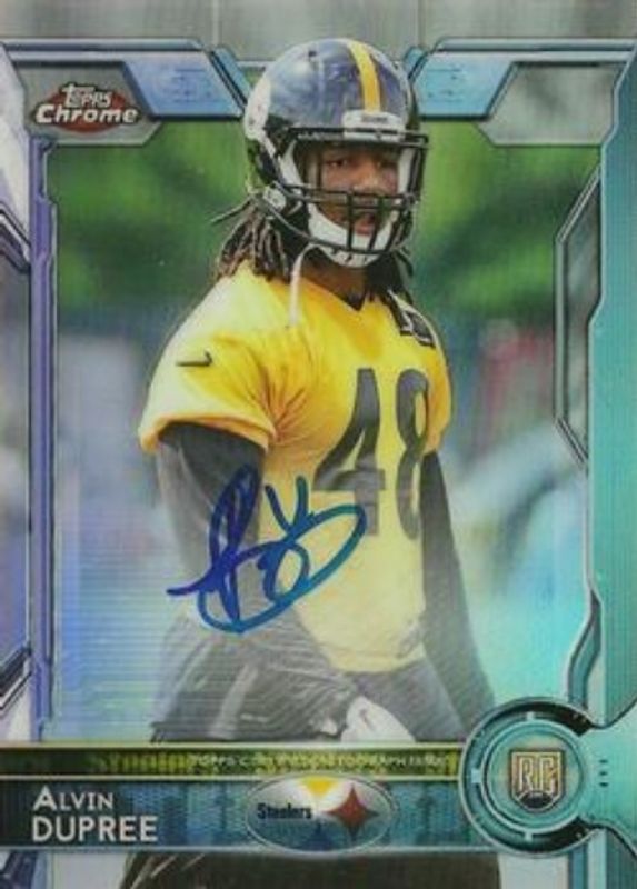 Alvin Dupree's Football cards are available in at least 9 sets. Alvin Dupree's biggest 7-day price movers are 2015 Topps Chrome #157 Rookie Autographs Refractor /150, 2015 Topps Chrome #157 Red Refractor /25, and 2015 Topps Chrome #157 Rookie Autographs - Pink Refractor /75.