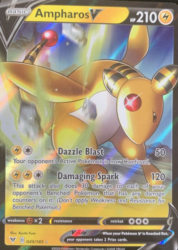 Ampharos V's Pokemon cards are available in at least 2 sets. Ampharos V's biggest 7-day price movers are 2020 Sword & Shield: Vivid Voltage #049/185 Holo, 2020 Sword & Shield: Vivid Voltage #171/185 Holo (Full Art), and 2020 Japanese Sword & Shield: Legendary Heartbeat #078/076 Super Rare.