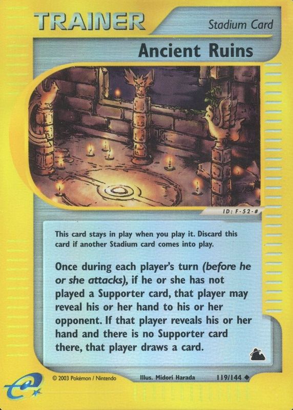 Ancient Ruins' Pokemon cards are available in at least 2 sets. Ancient Ruins' biggest 7-day price movers are 2003 Skyridge #119/144 Reverse Holo, 2003 Skyridge #119/144 Base, and 2002 Japanese Mysterious Mountains #84/88 1st Edition.