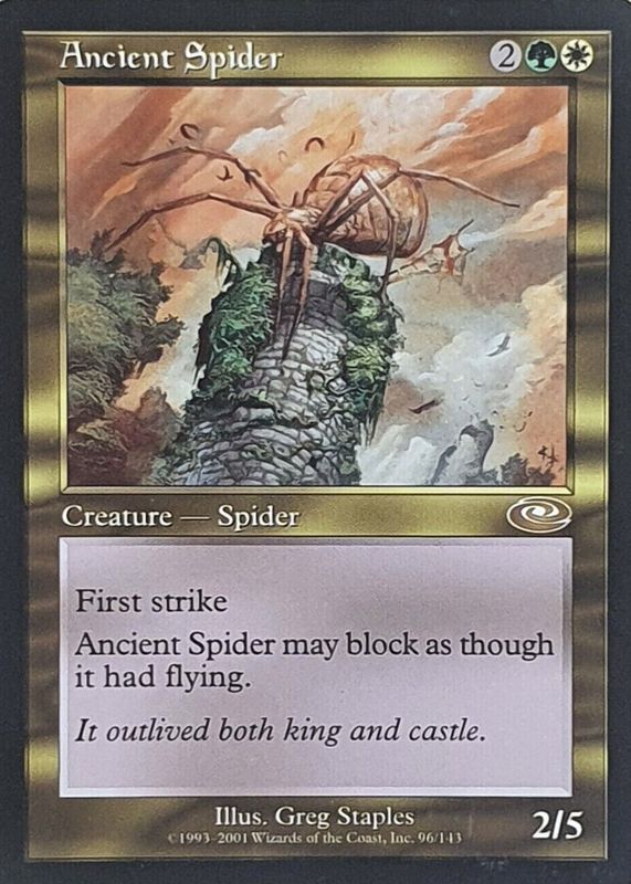 Ancient Spider's Magic: The Gathering cards are available in at least 1 sets. Ancient Spider's biggest 7-day price movers are 2001 Planeshift #96 Base, and 2001 Planeshift #96 Foil.