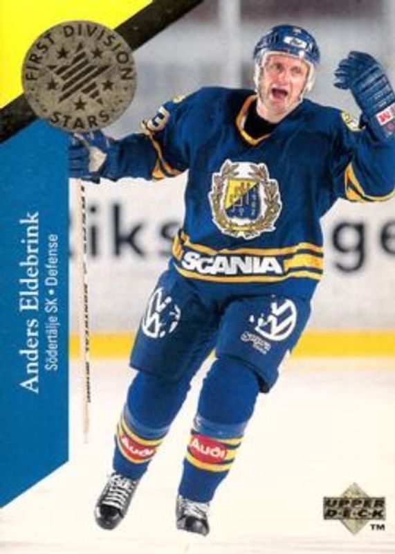 The biggest 30-day change Anders Eldebrink cards are 1995 Upper Deck Swedish Elite #DS6 First Division Stars, 1997 Upper Deck Collector's Choice Swedish #C27 You Crash the Game Exchange, and 1997 Upper Deck Collector's Choice Swedish #C27 You Crash the Game.