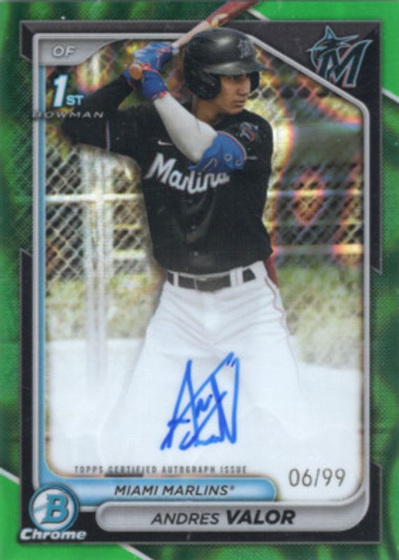 Andres Valor's Baseball cards are available in at least 3 sets. Andres Valor's biggest 7-day price movers are 2024 Bowman Chrome #CPA-AV Prospect Auto - Green Lava Refractor /99 (1st), 2024 Bowman Chrome #CPA-AV Prospect Auto - Purple Refractor /250 (1st), and 2024 Bowman Chrome Mega Box #BCP-196 Prospects - Aqua Mojo Refractor /299 (1st).