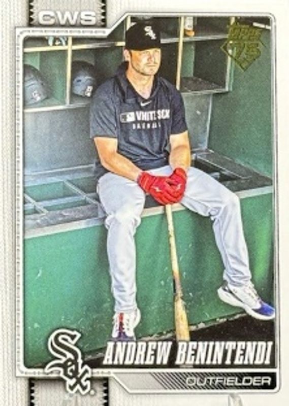 Andrew Benintendi's Baseball cards are available in at least 99 sets. Andrew Benintendi's biggest 7-day price movers are 2026 Topps #345 Golden Mirror Variation /(SSP), 2024 Topps Pristine #29 Superfractor /1, and 2024 Topps Museum Collection #MM-ABE Museum Memorabilia /1.