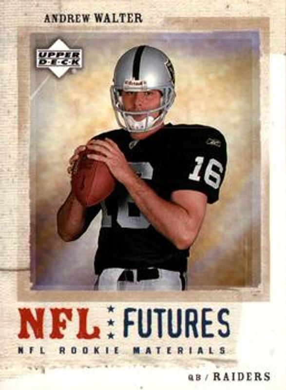 Andrew Walter's Football cards are available in at least 3 sets. Andrew Walter's biggest 7-day price movers are 2005 Upper Deck Rookie Materials #99 Base, 2005 Upper Deck Rookie Materials #R18 Rookie Jerseys, and 2005 Topps Heritage #57b Base.