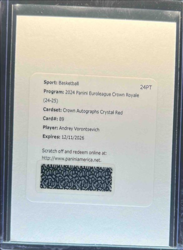 The biggest 30-day change Andrey Vorontsevich cards are 2024 Crown Royale EuroLeague #89 Crown Autographs - Crystal Red /25, 2024 Crown Royale EuroLeague #89 Crown Autographs - Crystal Platinum /1, and 2023 Prizm EuroLeague #TBD Champions Signatures - Mojo /25.