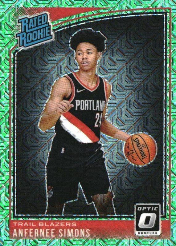 Anfernee Simons' Basketball cards are available in at least 123 sets. Anfernee Simons' biggest 7-day price movers are 2018 Optic #186 Fast Break Red /85, 2018 Optic #186 Choice Dragon /(SSP), and 2018 Optic #186 FOTL Purple Stars /13.