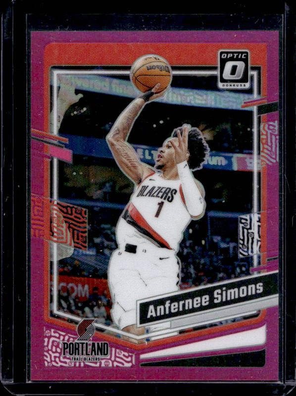 Anfernee Simons' Basketball cards are available in at least 122 sets. Anfernee Simons' biggest 7-day price movers are 2023 Optic #153 Pink /25, 2024 Donruss #114 Press Proof Silver, and 2024 Donruss #114 Holo Red & Blue Laser /15.