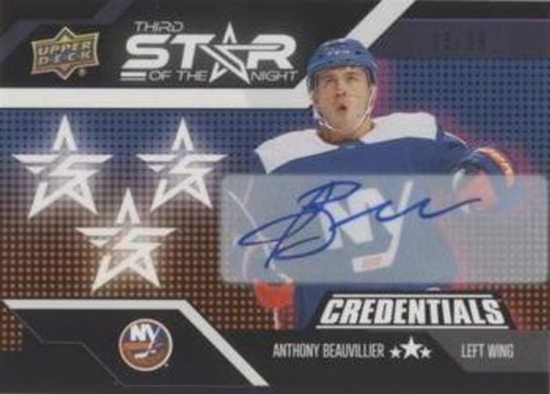 Anthony Beauvillier's Hockey cards are available in at least 26 sets. Anthony Beauvillier's biggest 7-day price movers are 2022 Upper Deck Credentials #3S-9 Star of the Night: Third Star Autographs /99, 2022 Upper Deck Credentials #SG-20 Speed of the Game Stars, and 2022 Upper Deck Credentials #3S-9 Star of the Night: Third Star.
