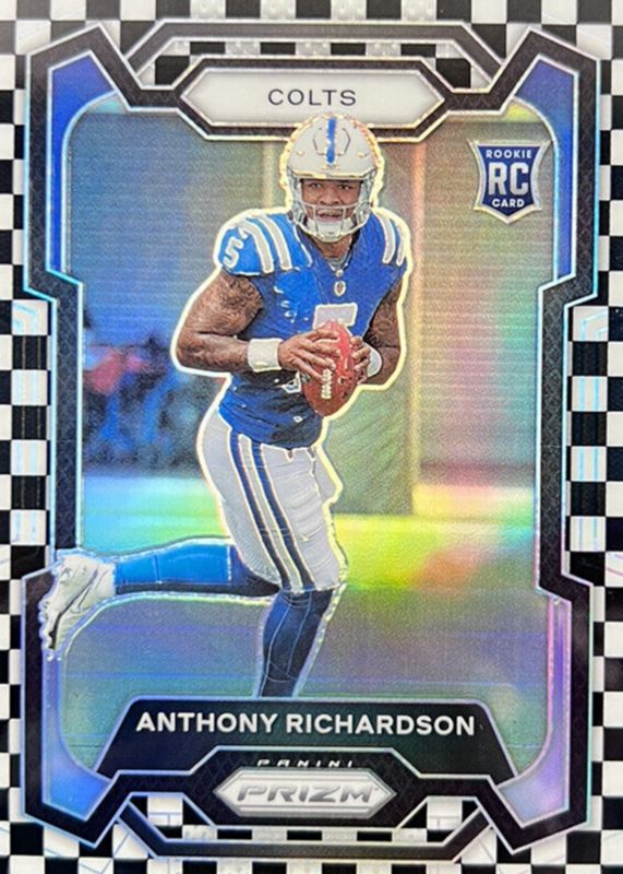 Anthony Richardson's Football cards are available in at least 77 sets. Anthony Richardson's biggest 7-day price movers are 2023 Prizm #343 Red White Blue, 2023 Donruss #RGK-2 Rookie Gridiron Kings, and 2023 Prizm #343 Black & White Checker /(SSP).