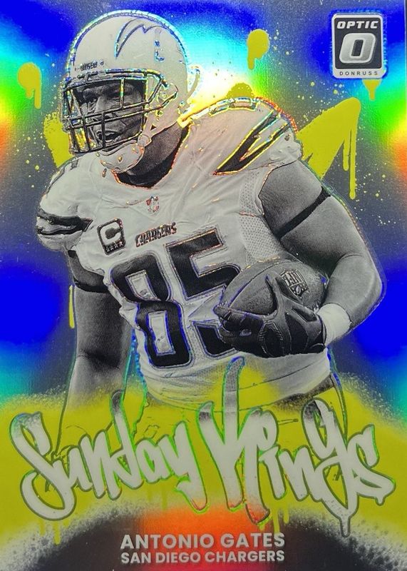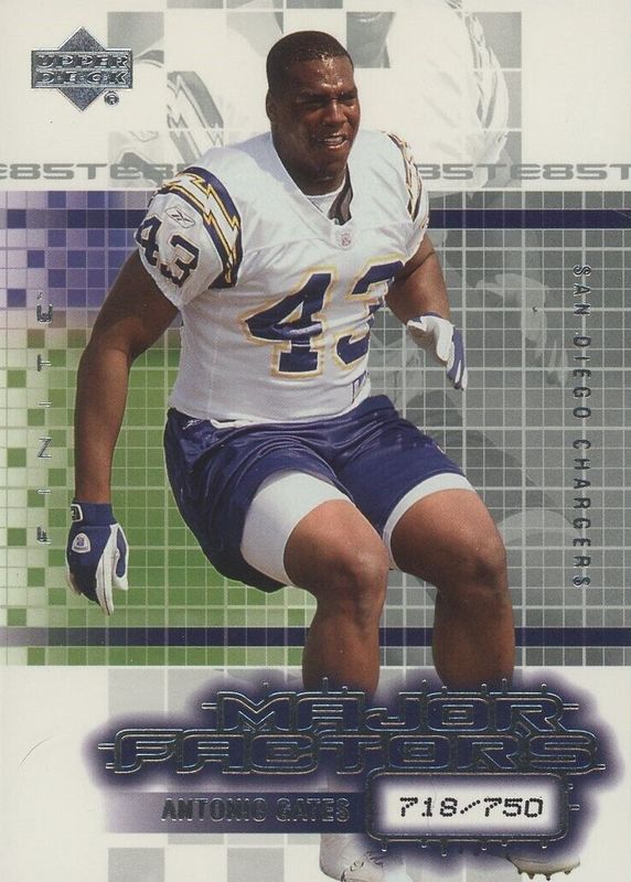 Antonio Gates' Football cards are available in at least 268 sets. Antonio Gates' biggest 7-day price movers are 2003 Upper Deck Finite #114 Major Factors /750, 2003 Leaf Rookies & Stars #132 Base, and 2025 Optic #28 Sunday Kings - Black Pandora /25.