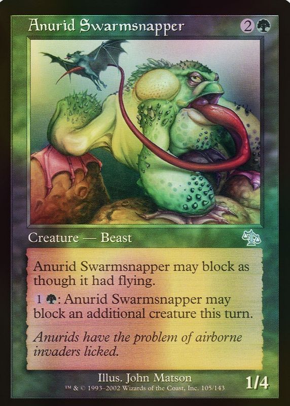Anurid Swarmsnapper's Magic: The Gathering cards are available in at least 1 sets. Anurid Swarmsnapper's biggest 7-day price movers are 2002 Judgment #105 Foil, and 2002 Judgment #105 Base.