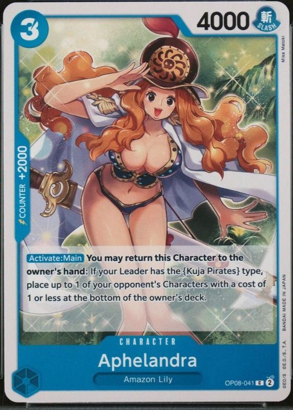 Aphelandra's One Piece cards are available in at least 1 sets. Aphelandra's biggest 7-day price movers are 2024 Two Legends #OP08-041 Base.