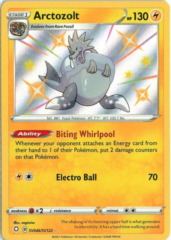 Arctozolt's Pokemon cards are available in at least 2 sets. Arctozolt's biggest 7-day price movers are 2021 Sword & Shield: Shining Fates #SV046 Shiny Rare, 2020 Sword & Shield: Black Star Promo #SWSH036 Build & Battle Box (Darkness Ablaze) (Staff), and 2020 Sword & Shield: Black Star Promo #SWSH036 Build & Battle Box (Darkness Ablaze).