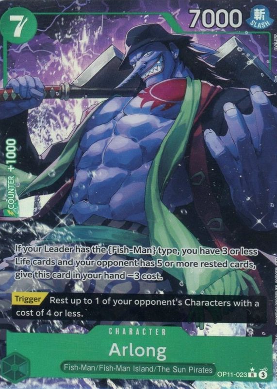 Arlong's One Piece cards are available in at least 3 sets. Arlong's biggest 7-day price movers are 2025 A Fist of Divine Speed #OP11-023 Foil (Alternate Art), 2025 Extra Booster: Anime 25th Collection #EB02-011 Super Rare (Alternate Art), and 2025 Extra Booster: Anime 25th Collection #EB02-011 Super Rare.
