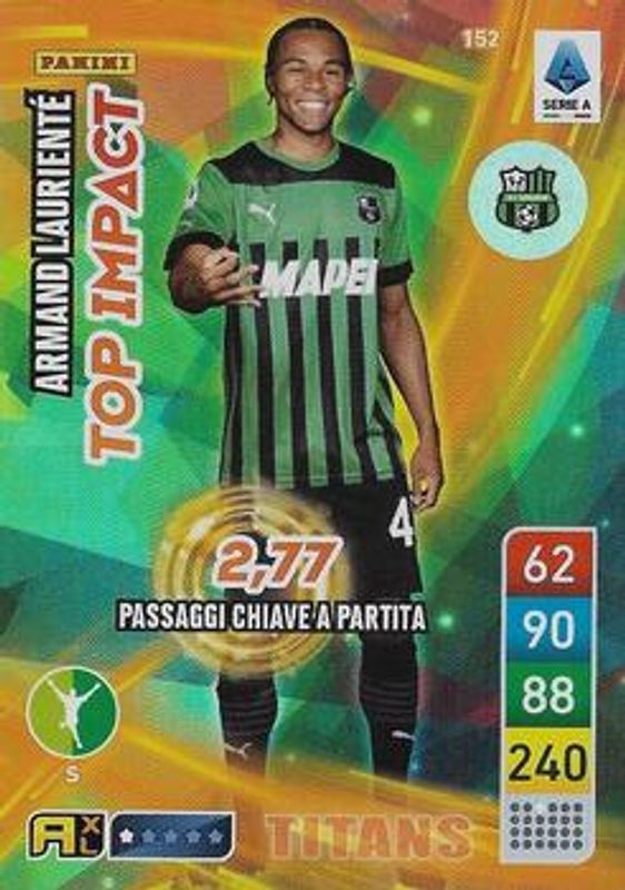 The biggest 30-day change Armand Lauriente cards are 2023 Panini Adrenalyn XL Calciatori Titans #152 Base, 2023 Panini Calciatori Stickers #450 Base, and 2023 Panini Calciatori Stickers #455 Base.