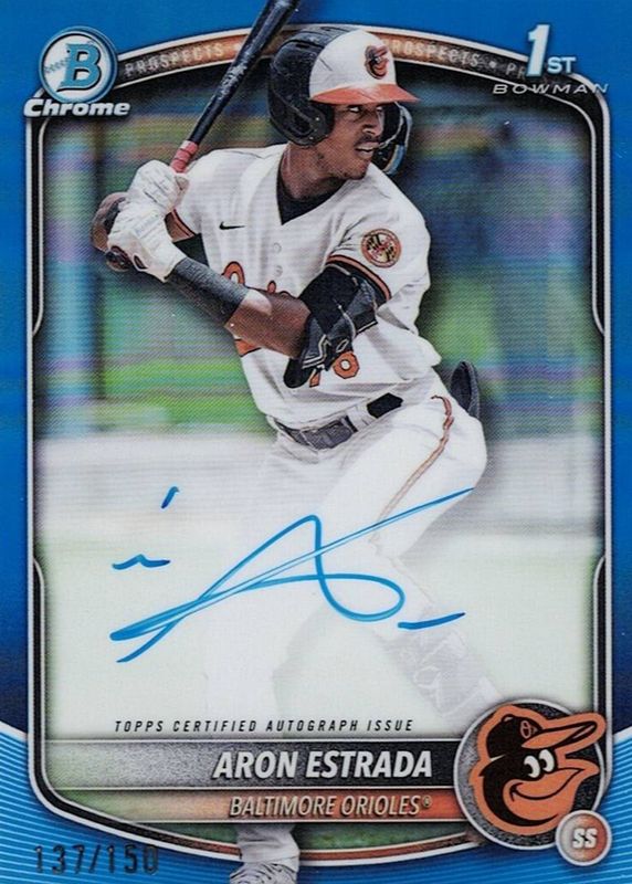 Aron Estrada's Baseball cards are available in at least 2 sets. Aron Estrada's biggest 7-day price movers are 2025 Bowman #CPA-AES Chrome Prospect Auto (1st), 2025 Bowman #CPA-AES Chrome Prospect Auto - Blue Refractor /150 (1st), and 2025 Bowman #CPA-AES Chrome Prospect Auto - Speckle Refractor /299 (1st).