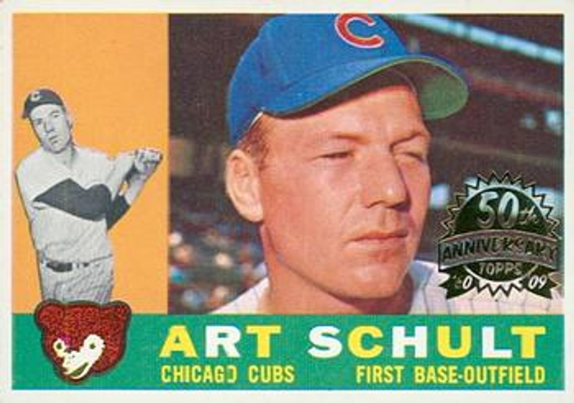Art Schult's Baseball cards are available in at least 6 sets. Art Schult's biggest 7-day price movers are 2009 Topps Heritage #93 50th Anniversary Buybacks, 2009 Topps Heritage #ROA-AS Real One Autographs, and 2009 Topps Heritage #AS Real One Autographs - Red Ink /60.