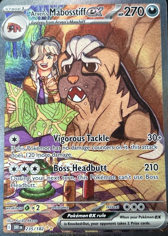 Arven's Mabosstiff ex's Pokemon cards are available in at least 2 sets. Arven's Mabosstiff ex's biggest 7-day price movers are 2025 Scarlet & Violet: Destined Rivals #235/182 Special Illustration Rare, 2025 Scarlet & Violet: Destined Rivals #218/182 Ultra Rare (Full Art), and 2025 Scarlet & Violet: Destined Rivals #139/182 Double Rare.