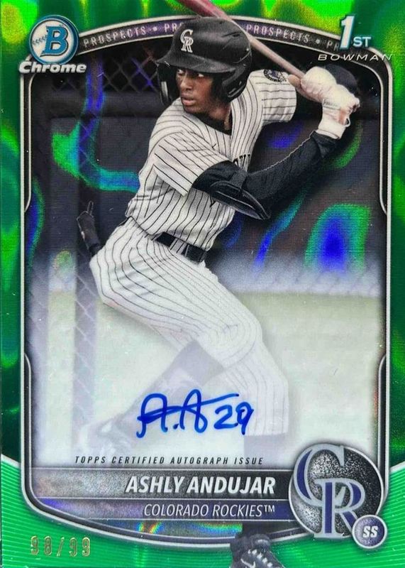 Ashly Andujar's Baseball cards are available in at least 2 sets. Ashly Andujar's biggest 7-day price movers are 2025 Bowman #CPA-AA Chrome Prospect Auto - Green Lava Refractor /99 (1st), 2025 Bowman #CPA-AA Chrome Prospect Auto (1st), and 2025 Bowman #CPA-AA Chrome Prospect Auto - Black Refractor /10 (1st).