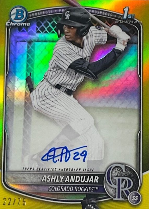 Ashly Andujar's Baseball cards are available in at least 2 sets. Ashly Andujar's biggest 7-day price movers are 2025 Bowman #CPA-AA Chrome Prospect Auto - Yellow Refractor /75 (1st), 2025 Bowman #CPA-AA Chrome Prospect Auto - Green Lava Refractor /99 (1st), and 2025 Bowman #CPA-AA Chrome Prospect Auto (1st).